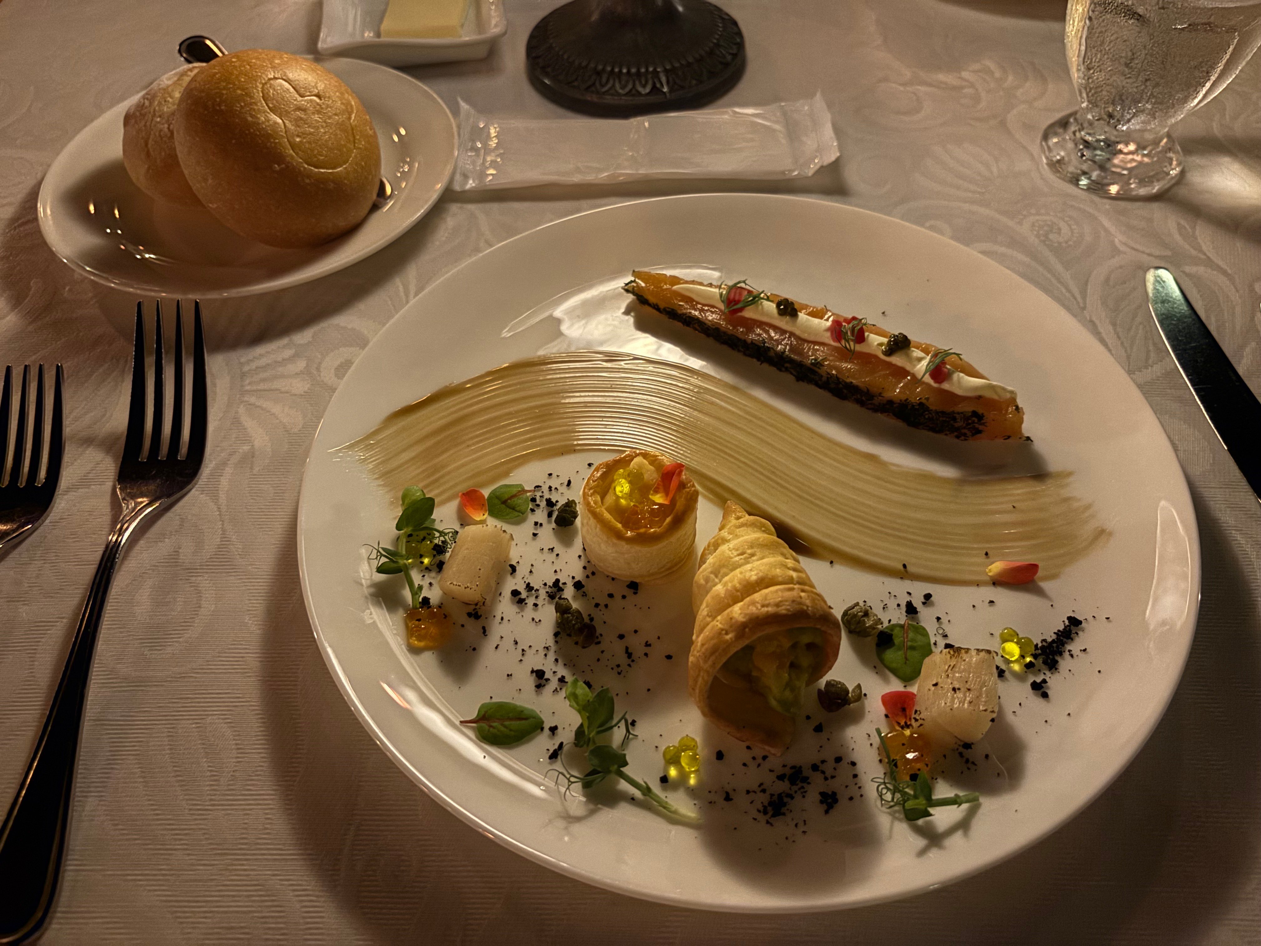 前菜、アントレ、デザート、パンが付いているコース料理です。